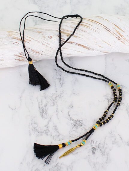 PP6704BL LONG CRYSTAL BEAD TASSEL NECKLACE – BLACK
