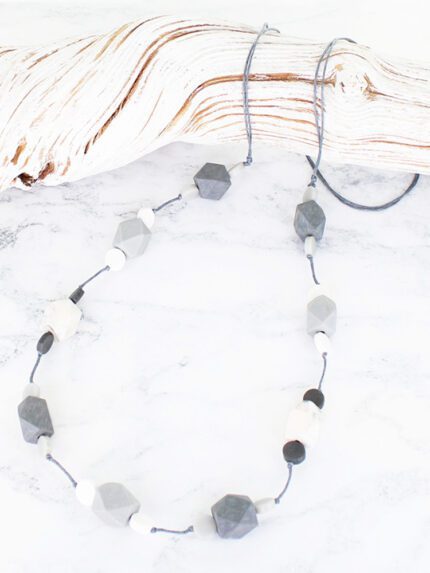 RS6903GY LONG RESIN DISC & FACETED CUBE NECKLACE – GREY MIX