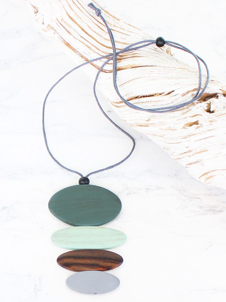 FB1309GN STACKED WOODEN OVAL PENDANT NECKLACE