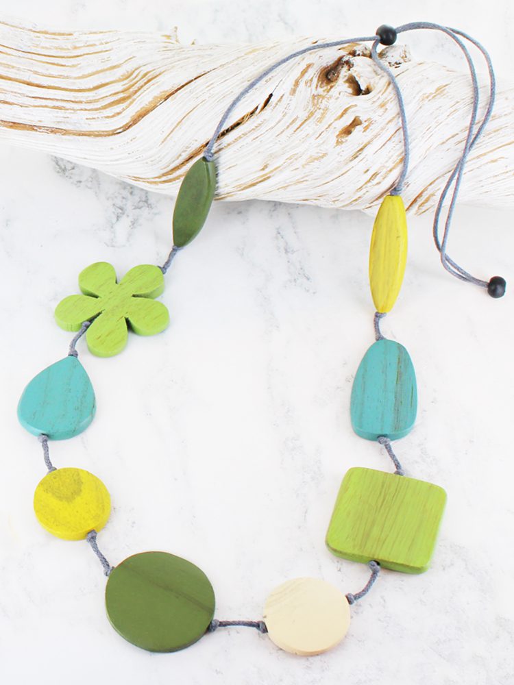 FB1402GN MIXED SHAPE WOODEN FLOWER NECKLACE