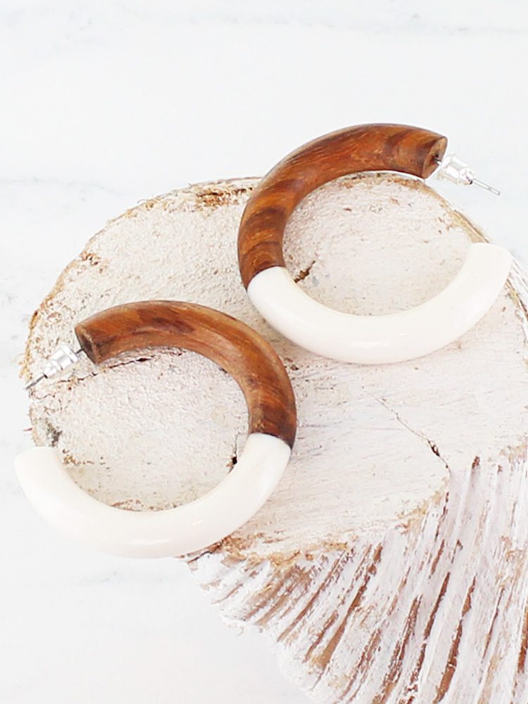 JP1022W HALF RESIN & HALF WOOD RESIN HOOP EARRING – WHITE