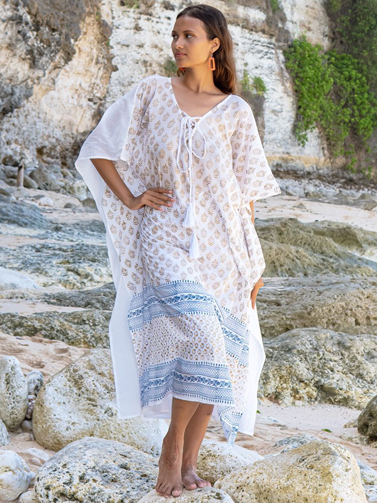 This kaftan is made in India using a traditional block printing method & ‘coolwash’ dying process.