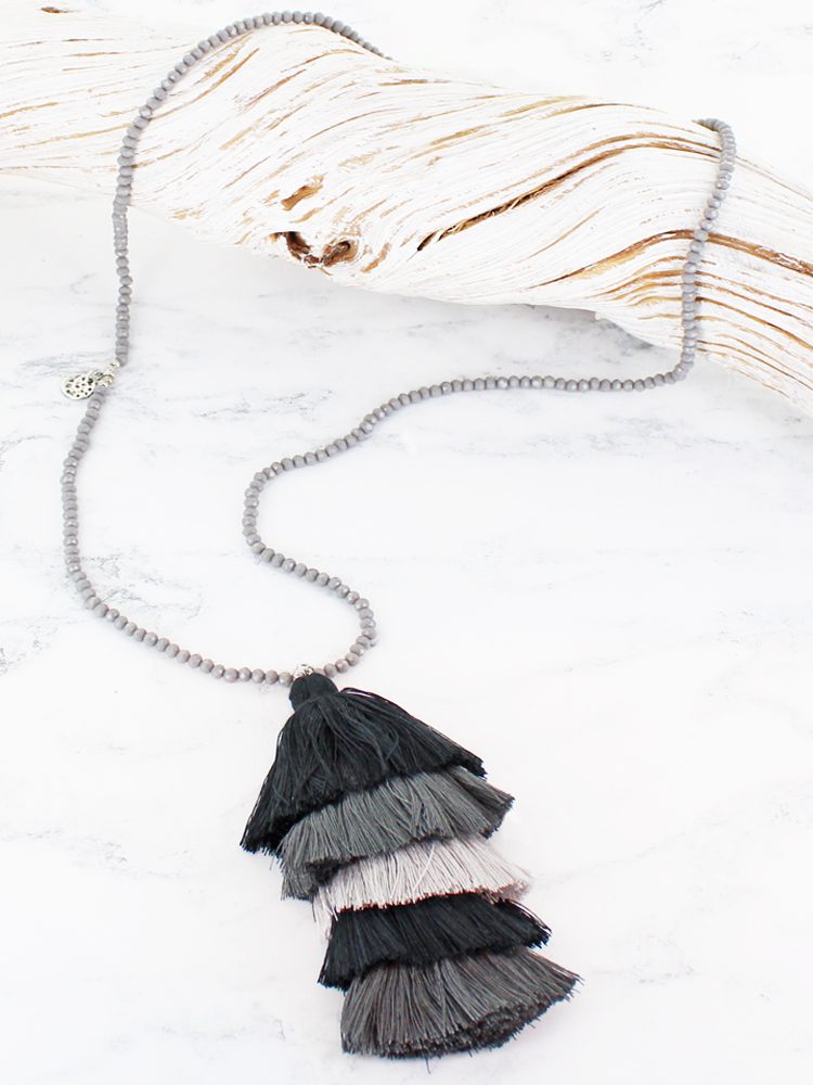 MA6806 LONG CRYSTAL BEAD NECKLACE WITH GREY TASSEL PENDANT