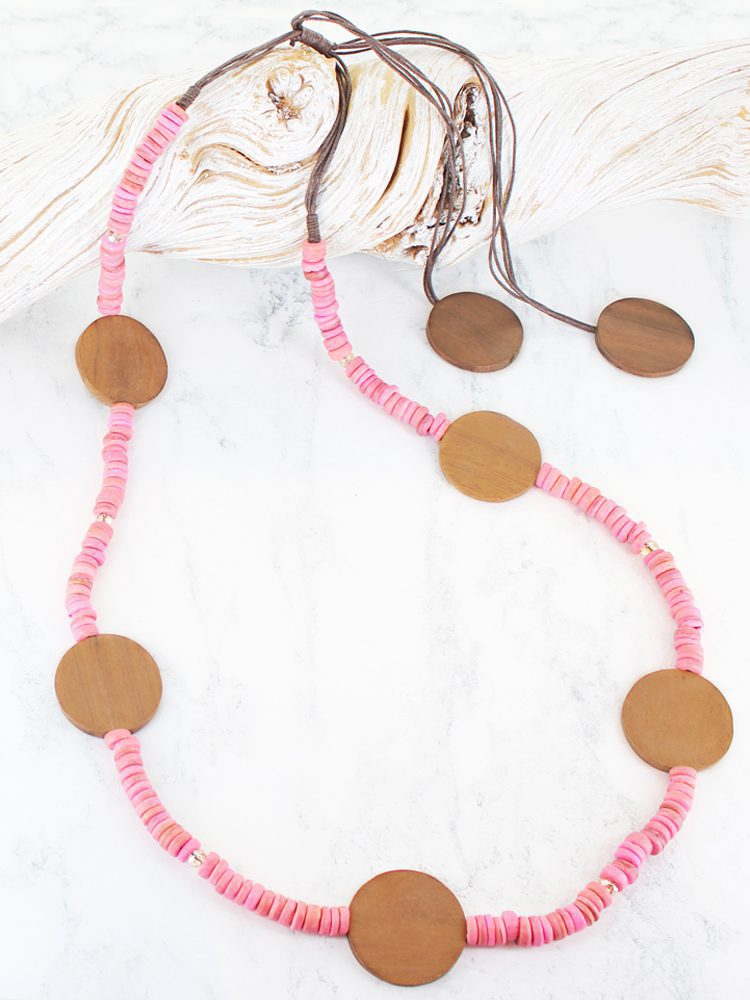 NB1406PK LONG BEADED WOODED DISC NECKLACE