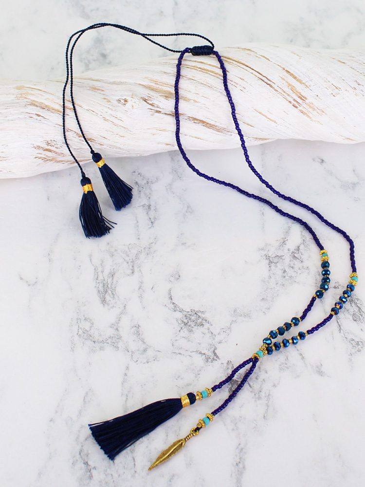 PP6209BLU DELICATE CRYSTAL BEAD TASSEL NECKLACE