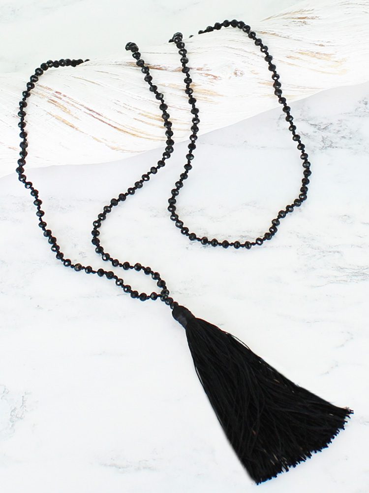 PP6704BL LONG CRYSTAL BEAD TASSEL NECKLACE – BLACK