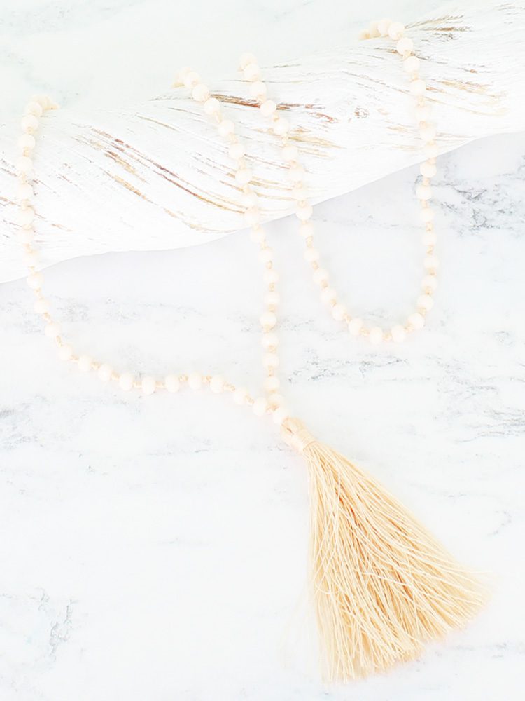 PP6704CR LONG CRYSTAL BEAD TASSEL NECKLACE – CREAM