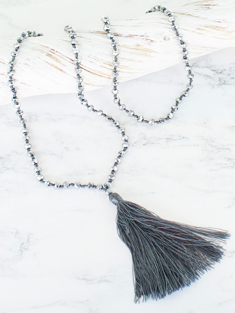 PP6704GY LONG METALLIC CRYSTAL BEAD TASSEL NECKLACE
