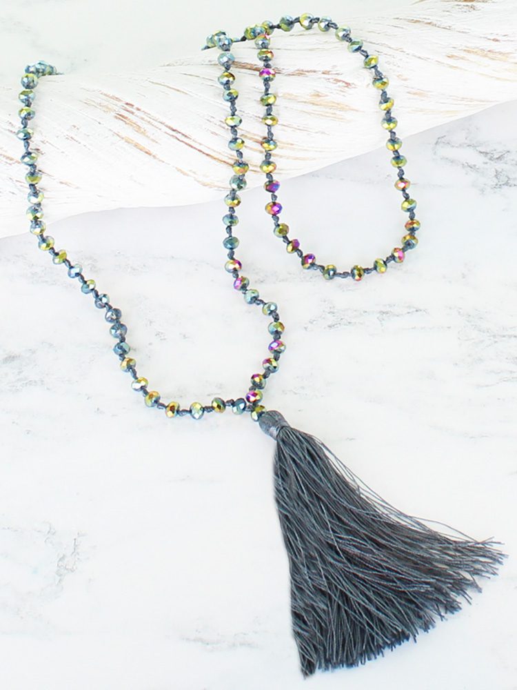 PP6704P LONG METALLIC CRYSTAL BEAD TASSEL NECKLACE