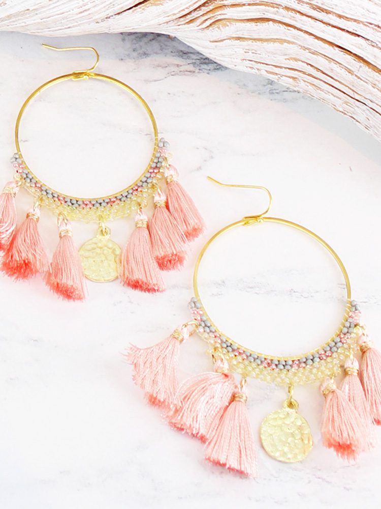 SJ1307PK HOOP & TASSEL STATEMENT EARRINGS