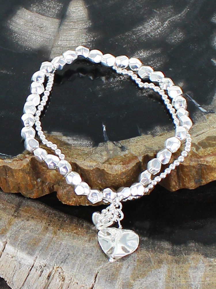 SP005H ELASTICATED 2-STRAND BRACELET WITH HEART CHARMS [SILVER-PLATE]